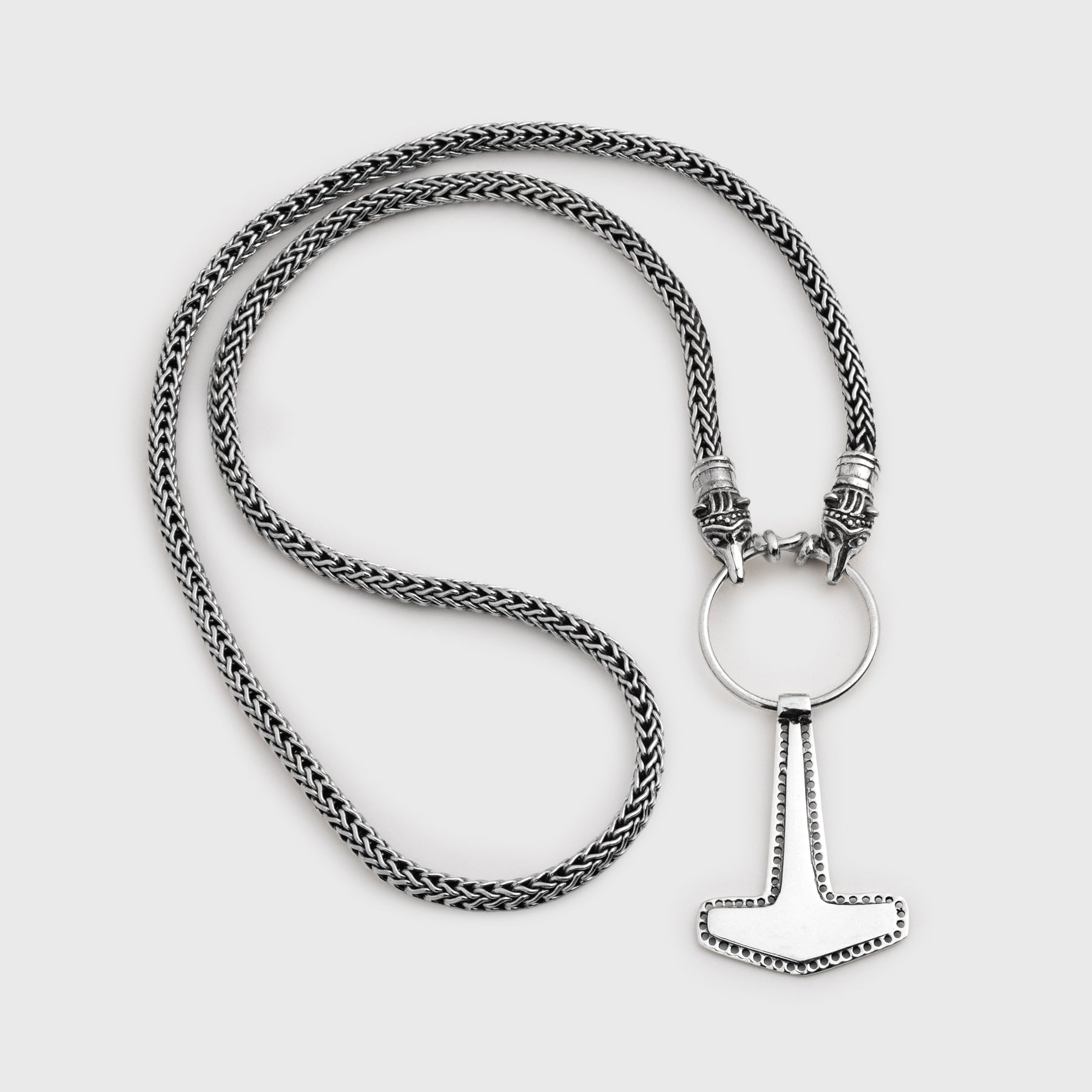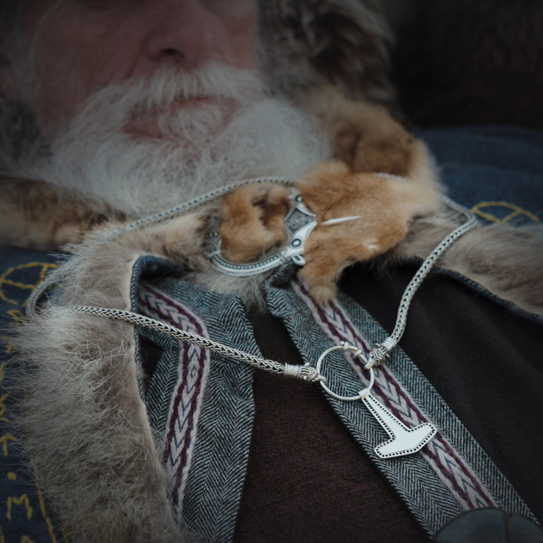 Kedjan, den delade ringen och björnhuvudena är 100 % handgjorda av massivt sterlingsilver 925. Björnhuvudena är baserade på det unika fyndet i Eketorp, Sverige, 2017. Den delade ringen är enkel att öppna och stänga, vilket gör att olika hängen kan hängas i den och att kedjan kan tas av och sättas på enkelt.