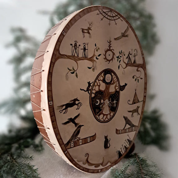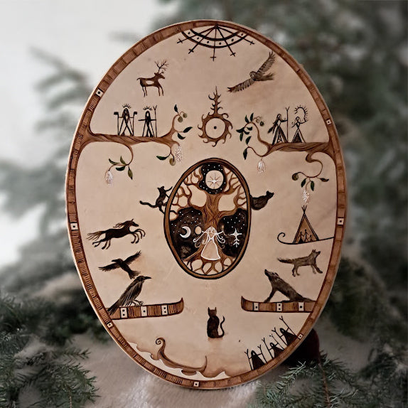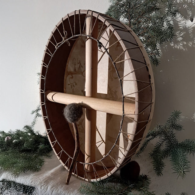 Traditionell shamantrumma som är omsorgsfullt handgjord i Finland, där gamla nordiska shamantraditioner har överlevt genom århundradena. Den har tillverkats av traditionella material utan användning av några verktyg. Endast en handsåg, en kniv och sandpapper har använts under processen. Denna tillverkningsmetod tar tid, men det är nödvändigt för att trumman ska få en egen ande.