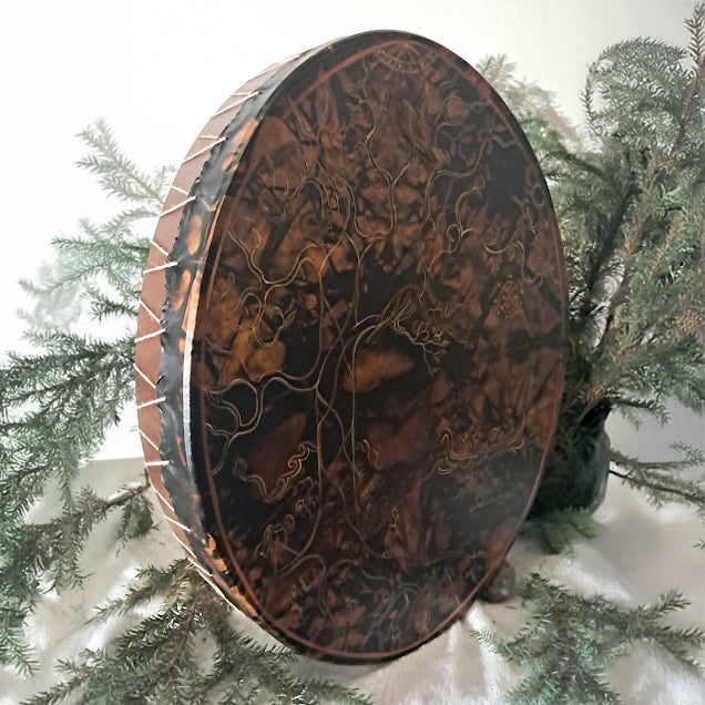 Traditionell shamantrumma som är omsorgsfullt handgjord i Finland, där gamla nordiska shamantraditioner har överlevt genom århundradena. Den har tillverkats av traditionella material utan användning av några verktyg. Endast en handsåg, en kniv och sandpapper har använts under processen. Denna tillverkningsmetod tar tid, men det är nödvändigt för att trumman ska få en egen ande.
