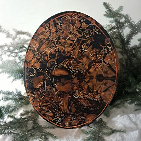 Yggdrasil, världsträdet, är vackert målat för hand på trumskinnet. Yggdrasil var väldigt viktigt för vikingarna - hela universum är byggt runt det.