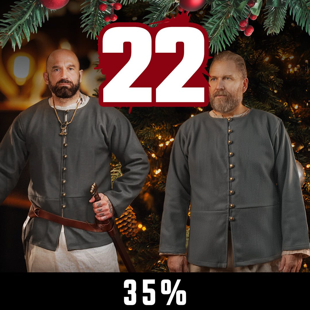 Slitstark jacka i ull, baserad på klädesplagg från hamnen i Hedeby. Det är inte känt hur den hölls ihop, så det finns många alternativ. Vi har valt alternativet med mässingsknappar, vilket ger en snygg passform.