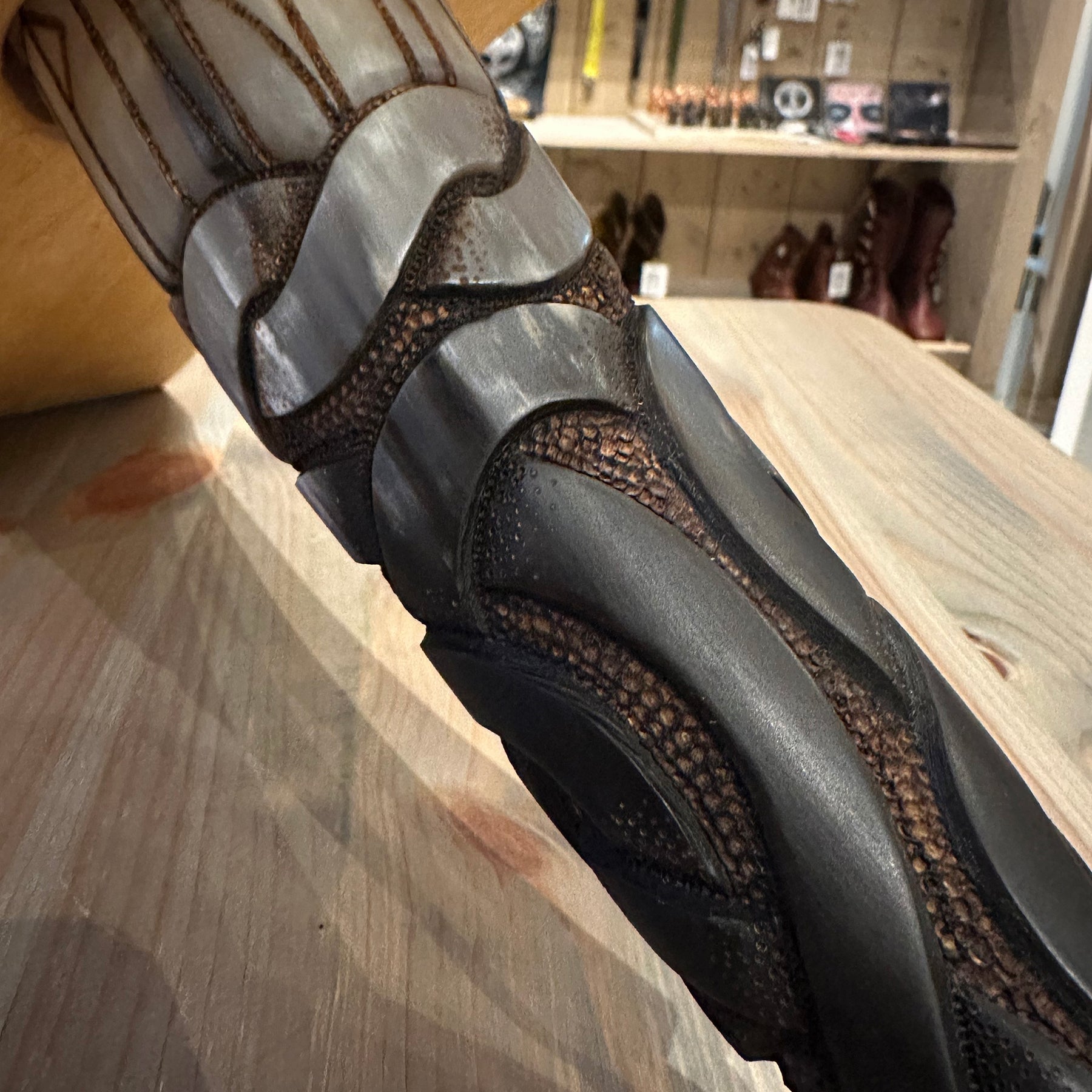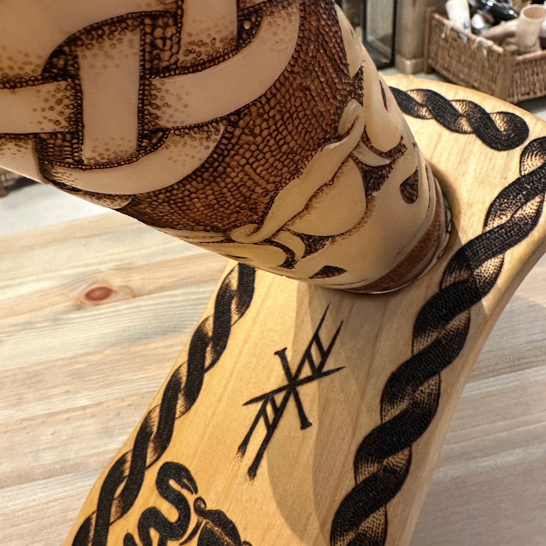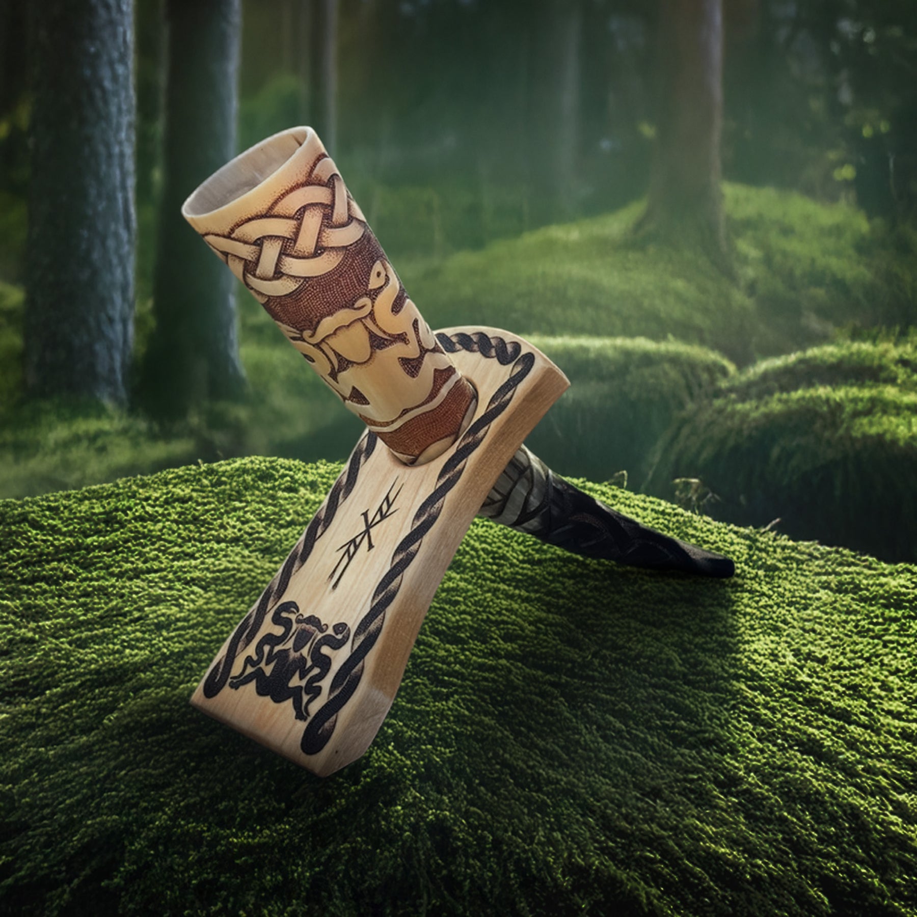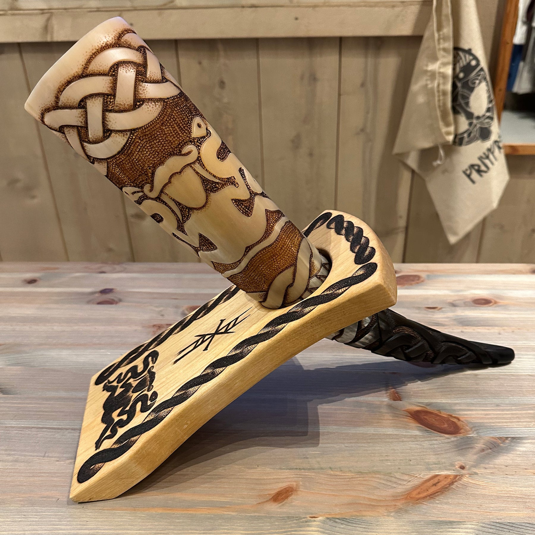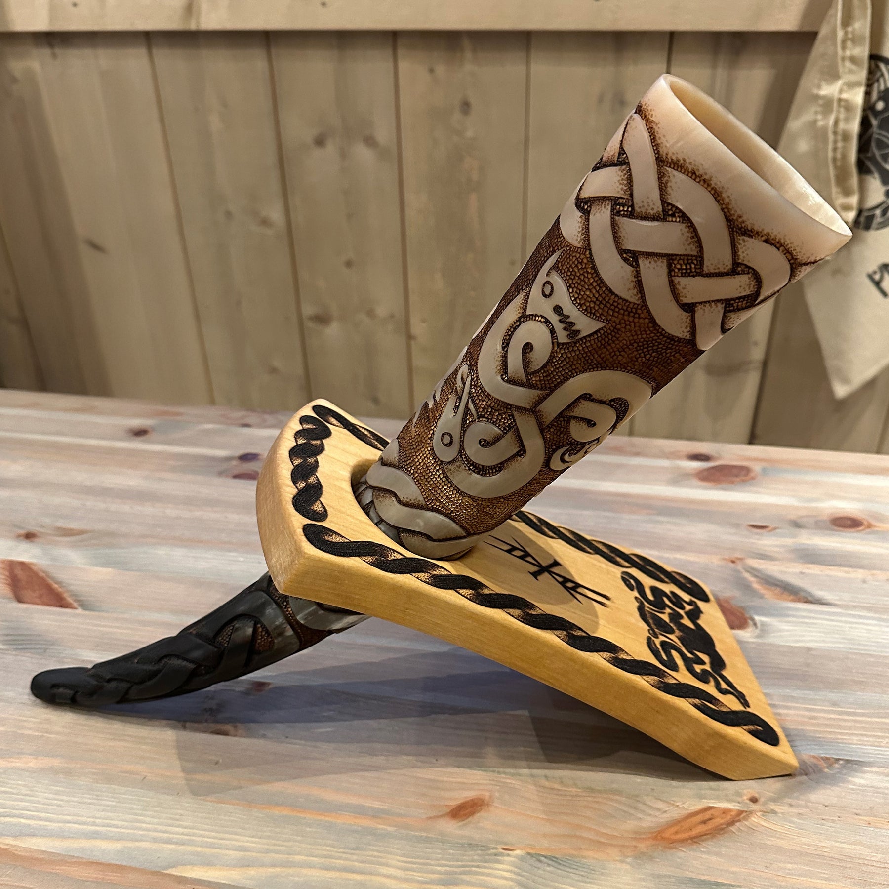 Den tidskrävande processen att tillverka våra Premium-horn kräver en kombination av hög konstnärlig skicklighet och hantverksexpertis. Varje specialdesignat motiv är utformat för sitt ändamål och handskuret i hornet. Det handgjorda trästället matchar hornet i fråga om kvalitet och hantverk. Varje horn är ett unikt konstverk som är troget sin äkthet och kvalitet.