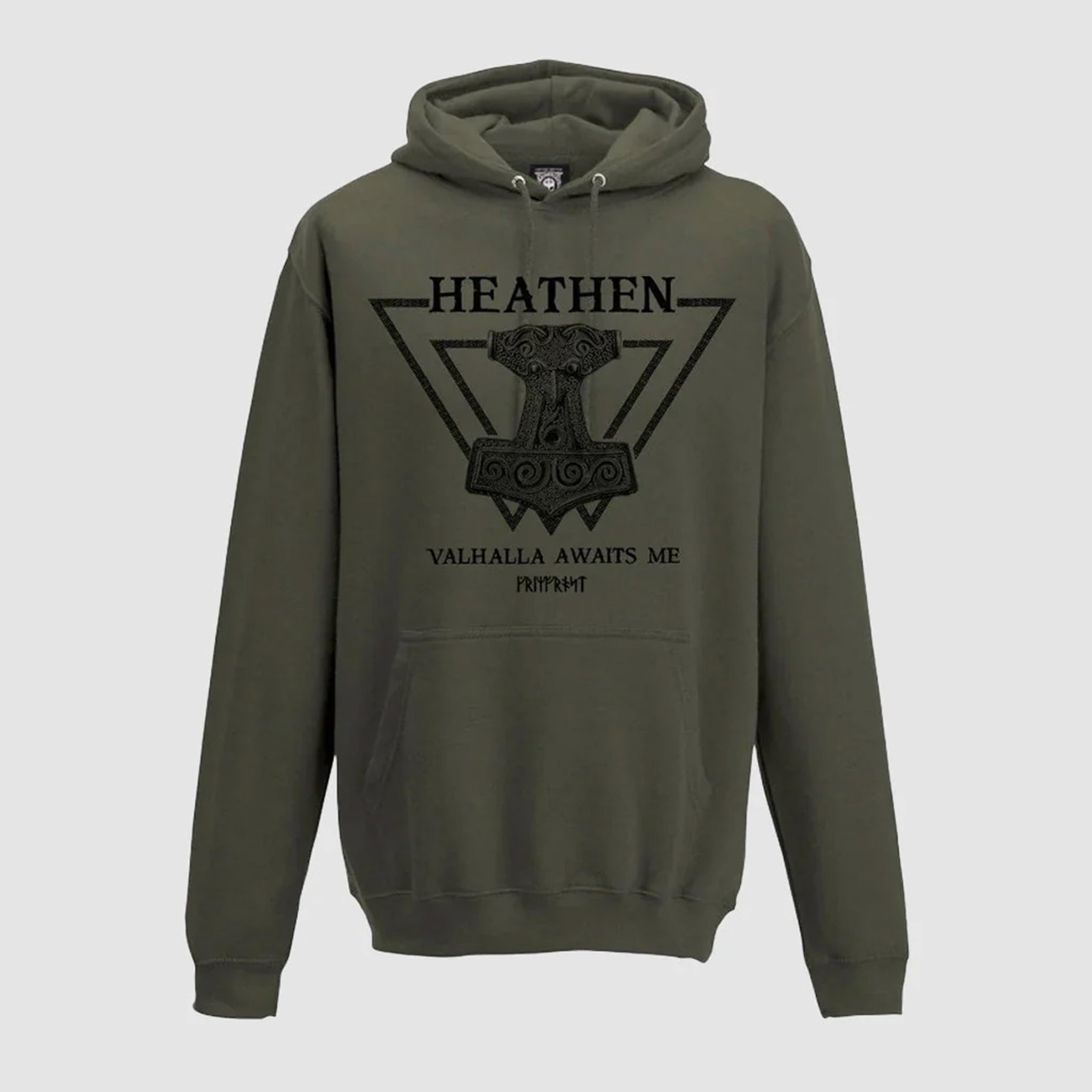 Denna huvtröja i premiumkvalitet är speciellt framtagen för Grimfrost och är tillverkad i mjuk, lyxig ekologisk bomull. Även färg- och tryckprocesserna är helt ekologiska, vilket är bra för både dig och Moder Jord. Huvtröjan har en ficka med dragkedja på vänster arm och rymliga påsfickor. Som kronan på verket har vi dekorerat dragskoöglorna med en cirkel av runor från den yngre Futharken.