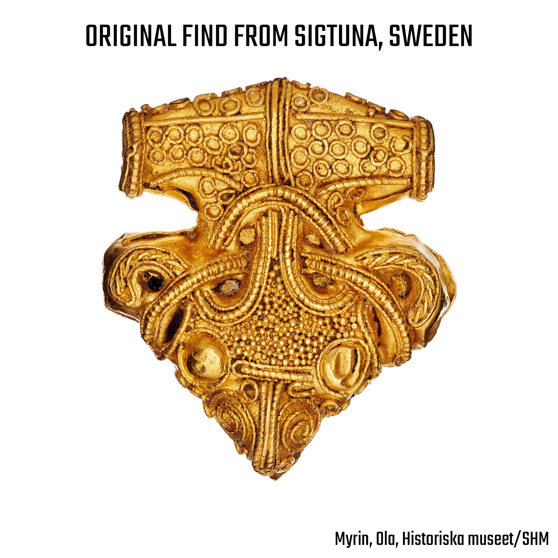 En trogen och omsorgsfullt handgjord replika av Tors hammare som hittades i Sigtuna, Sverige. Hammaren har en stiliserad form av ett korphuvud och är täckt med filigran och granulering.