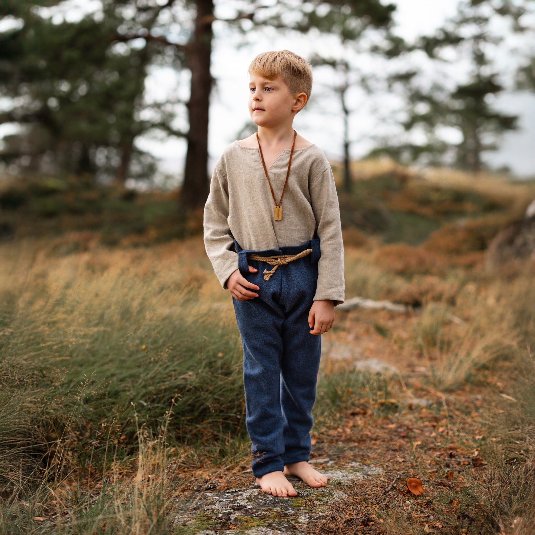 Historiskt korrekta byxor av hög kvalitet tillverkade av slitstarkt och mjukt ylle med fiskbensmönster. De är baserade på det ursprungliga paret som hittades i Torsberga (=Thors berg), Sverige. Fiskbensmönstrat ylle var vanligt under vikingatiden.