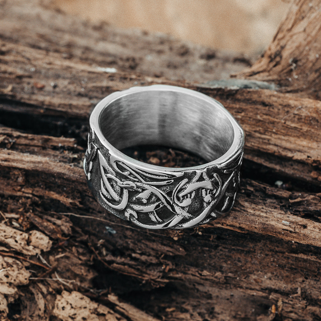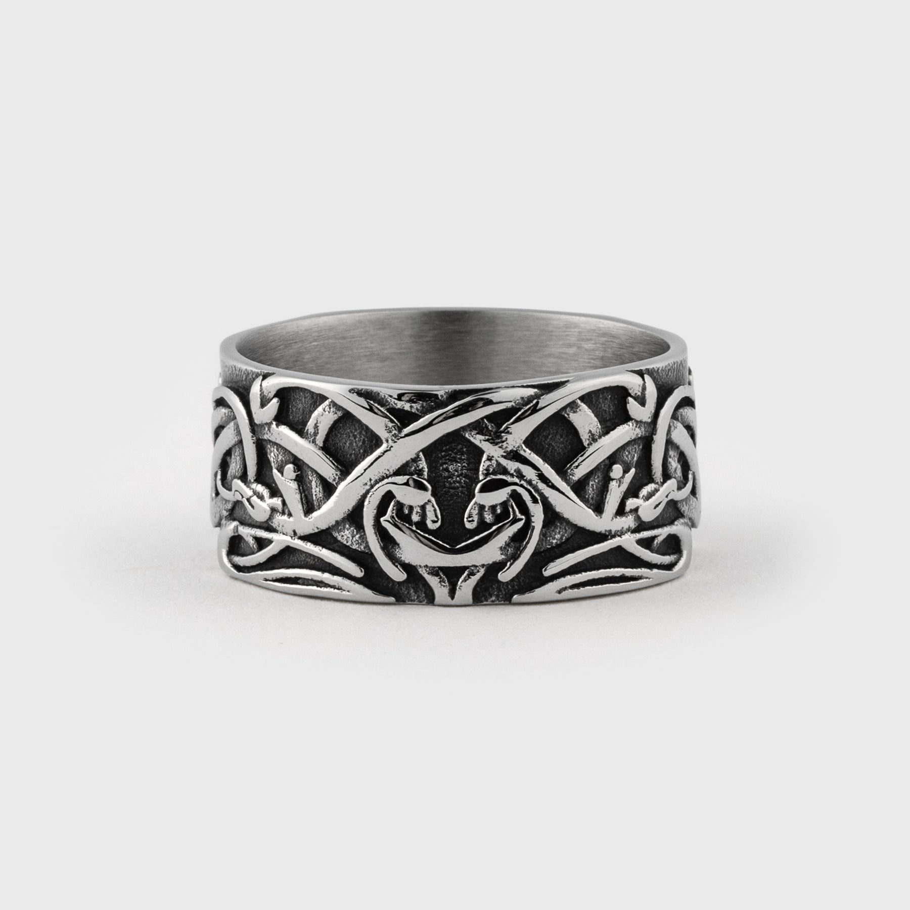 Ring tillverkad i solitt rostfritt stål. Ringen har ett knutmönster som var populärt under vikingatiden.