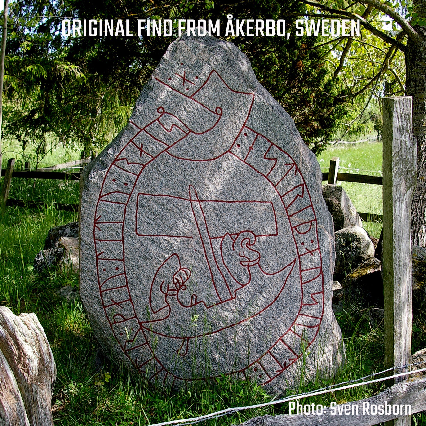 Detta hänge i keramik har fått sin design från runstenen i Stratomta, belägen i Åkerbo, Sverige. Stenen är ett betydelsefullt monument från vikingatiden, gjord av gnejs, med runor på tre sidor samt en bild av ett skepp. Varje hänge är individuellt tillverkat, vilket ger det en unik färg och struktur. Kommer med ett justerbart snöre.