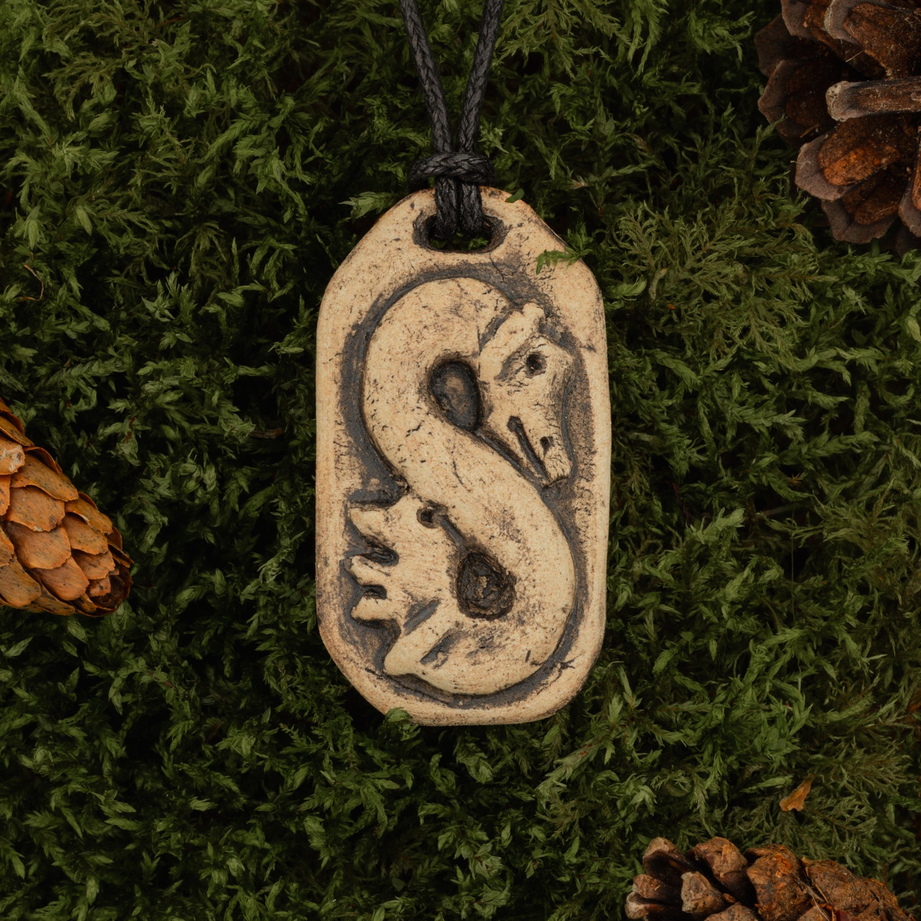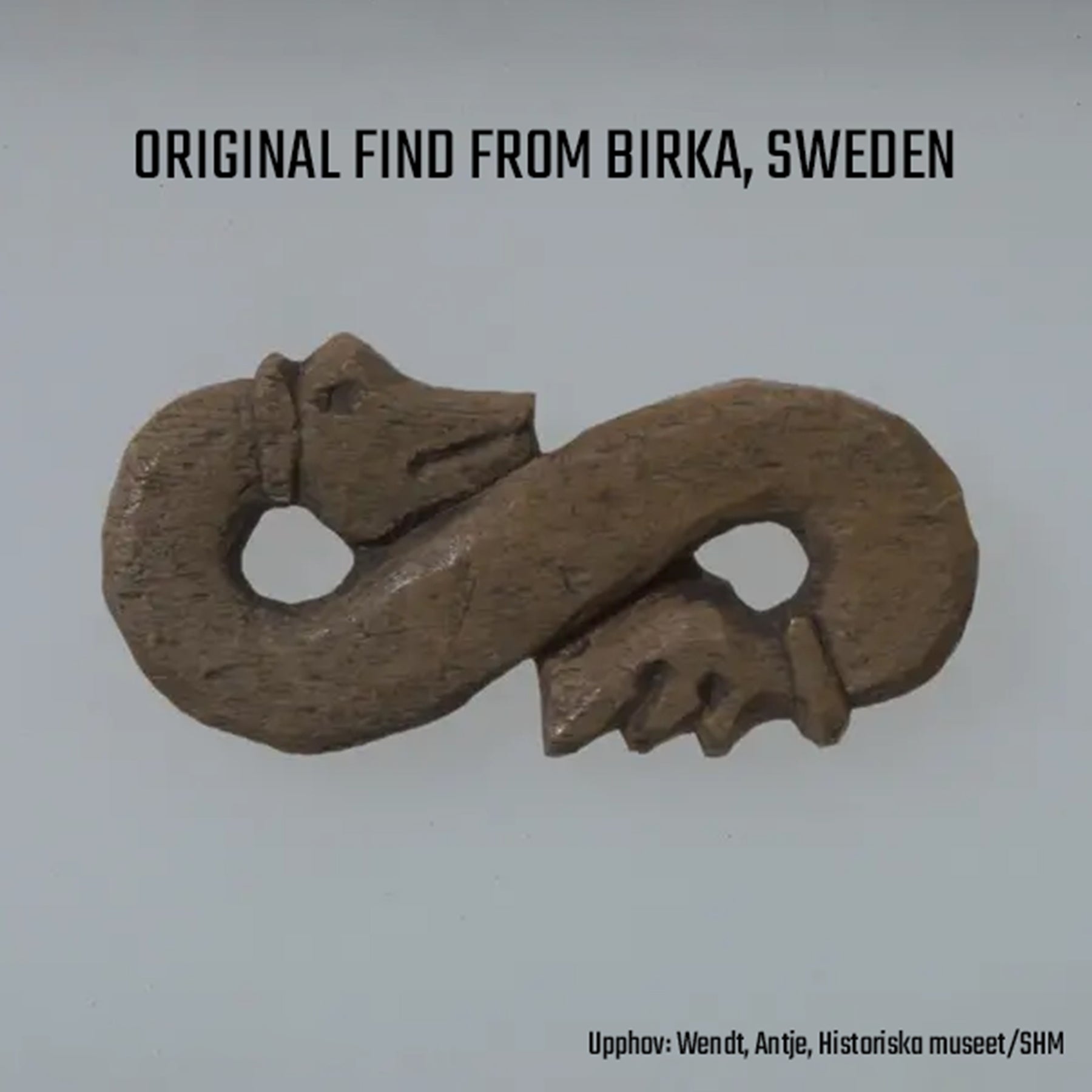Detta hänge är en representation av ett smycke från vikingatiden som troligen användes som klädesplagg eller som väskknäppning, baserat på fynd från Svarta jorden, Birka, Sverige. Smycken från Birka speglar ofta vikingarnas hantverk och skicklighet. Kommer med ett justerbart snöre.