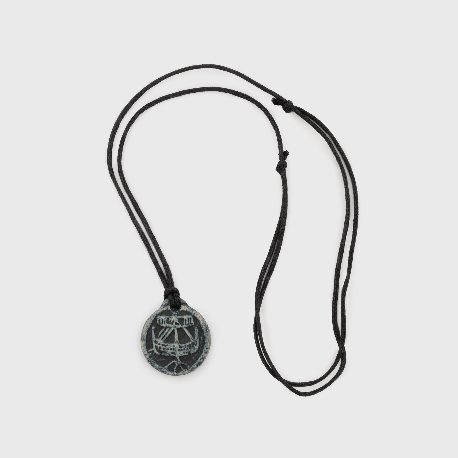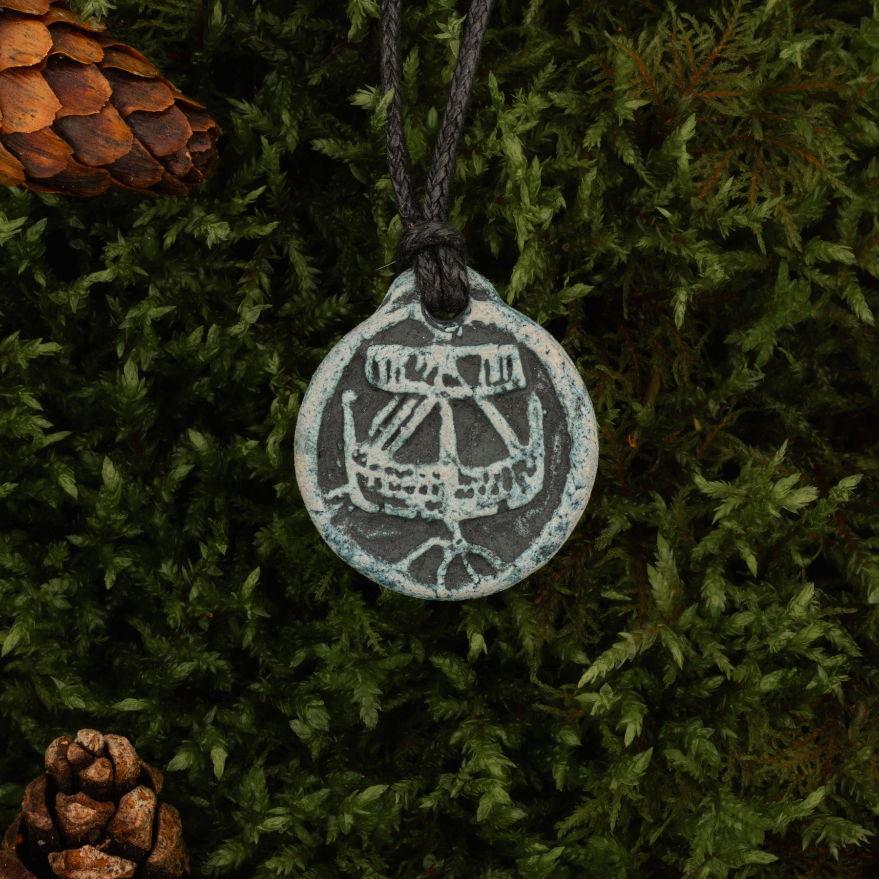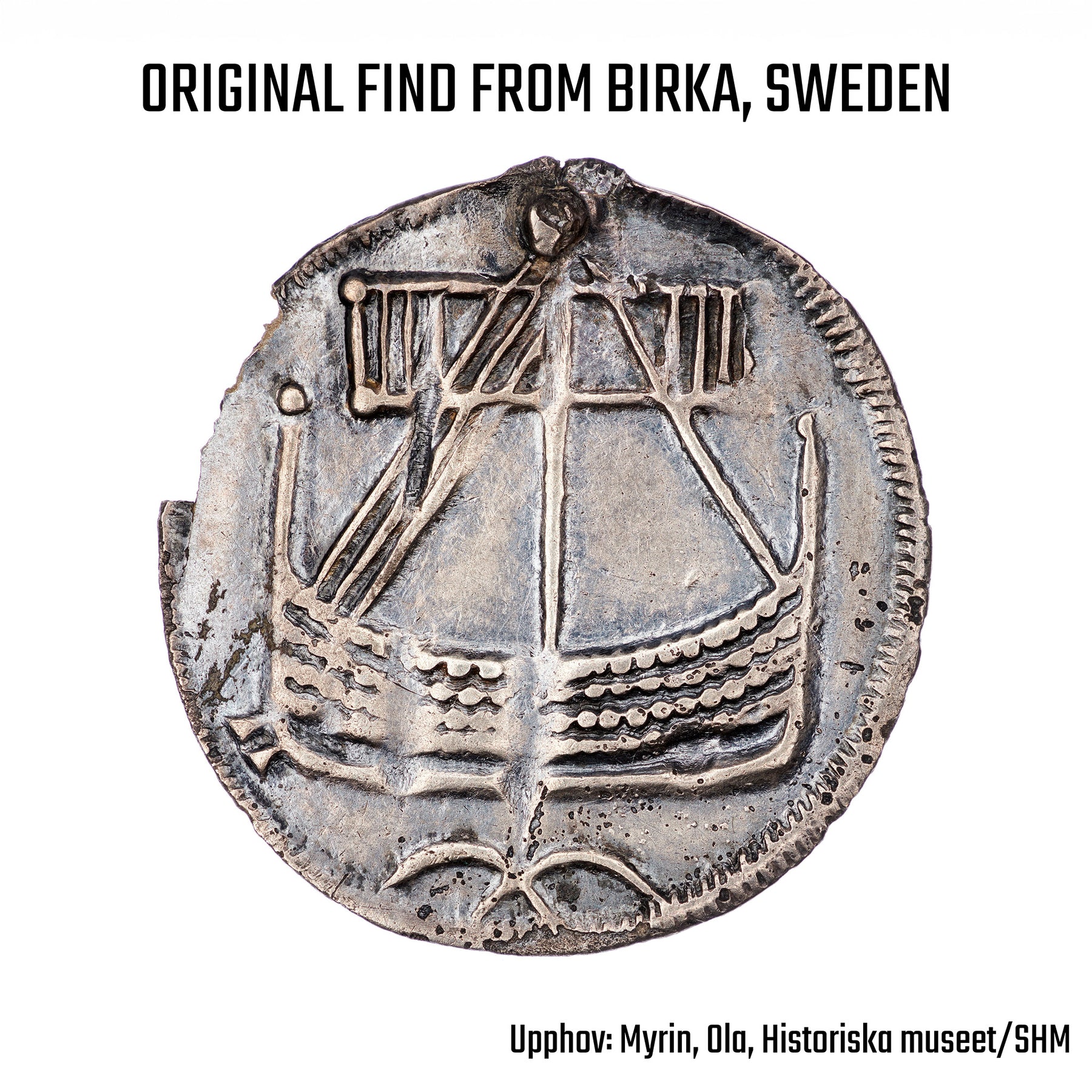 Denna hänge är en tolkning av ett silvermynt från vikingatiden, ursprungligen präglat i Hedeby, ett viktigt handelscentrum på den tiden. Det ursprungliga myntet upptäcktes i Birka, vilket speglar de långväga handelsnätverk som band samman bosättningar runt Östersjön. Skeppsmotivet symboliserar sjöfartens centrala roll och de starka banden mellan de tidiga städerna i Norden. Varje hänge är individuellt tillverkat, vilket ger det en unik färg och struktur. Kommer med ett justerbart snöre.