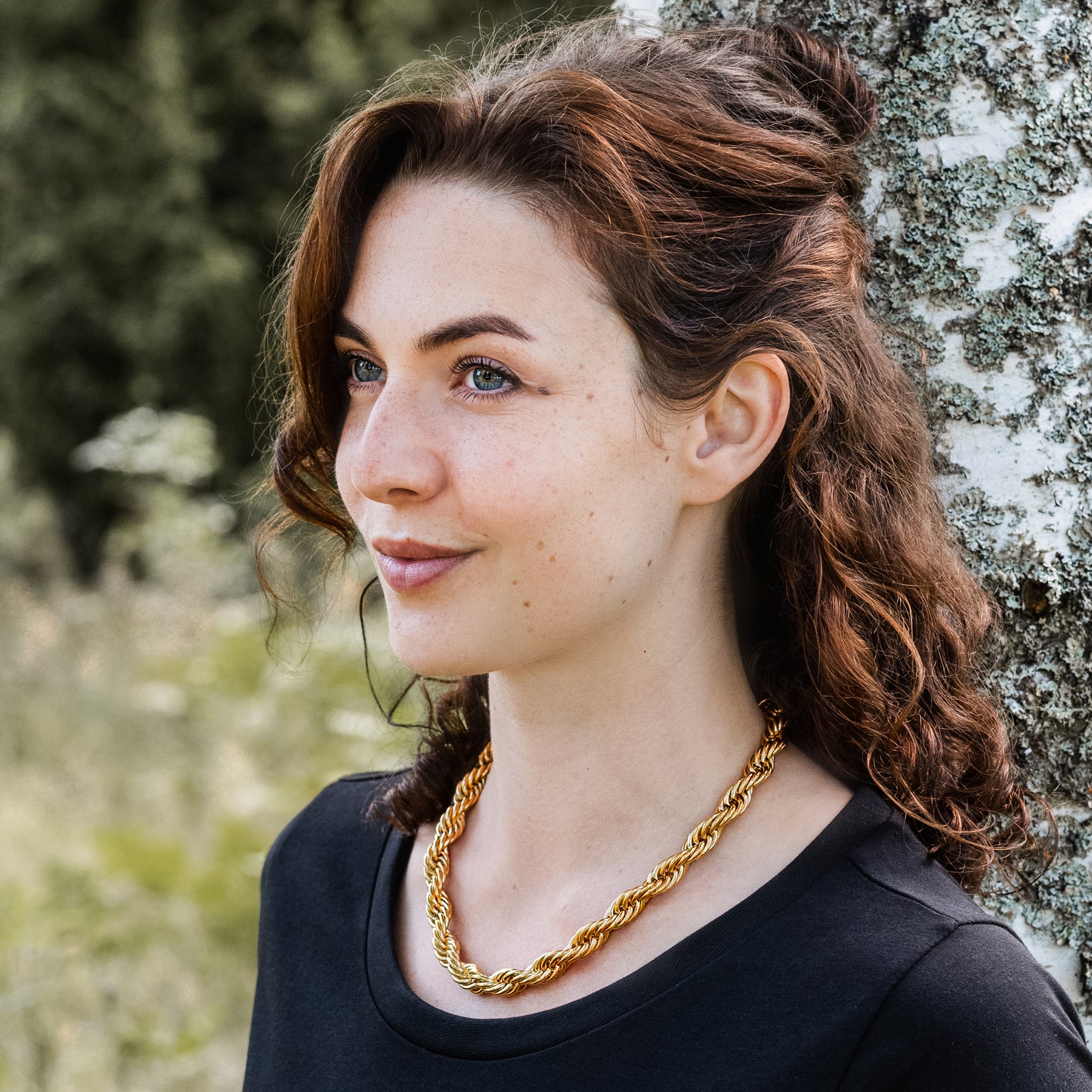 Rope chain link, twisted and woven to form the appearance of a rope. Worn as a solitaire or with a pendant.