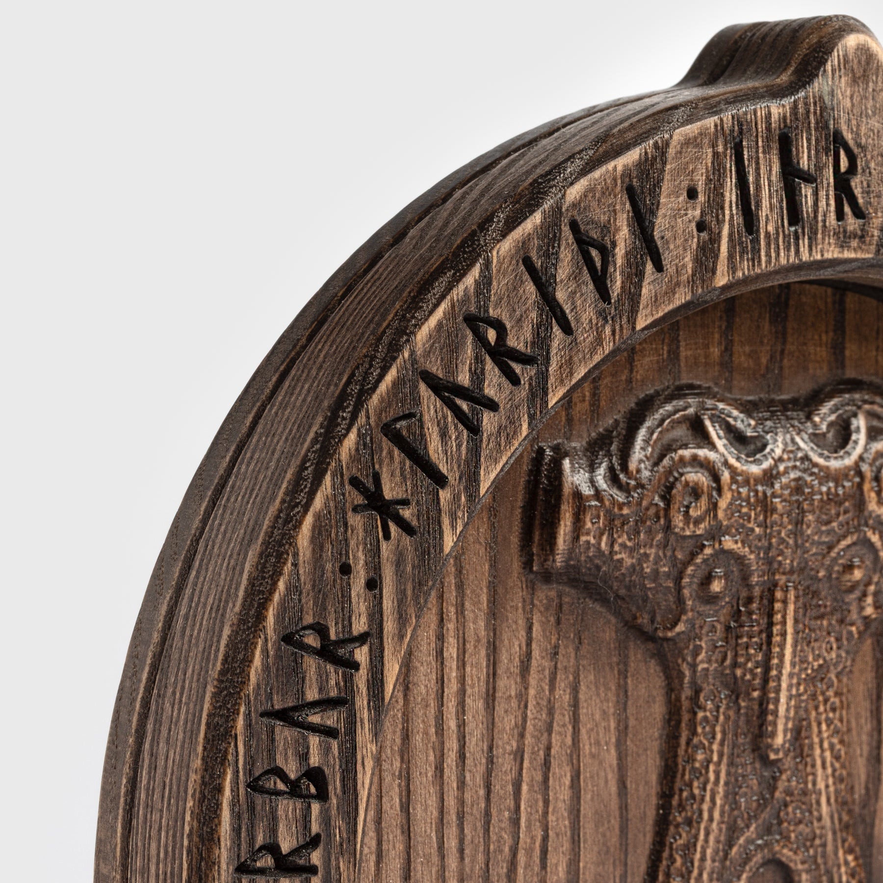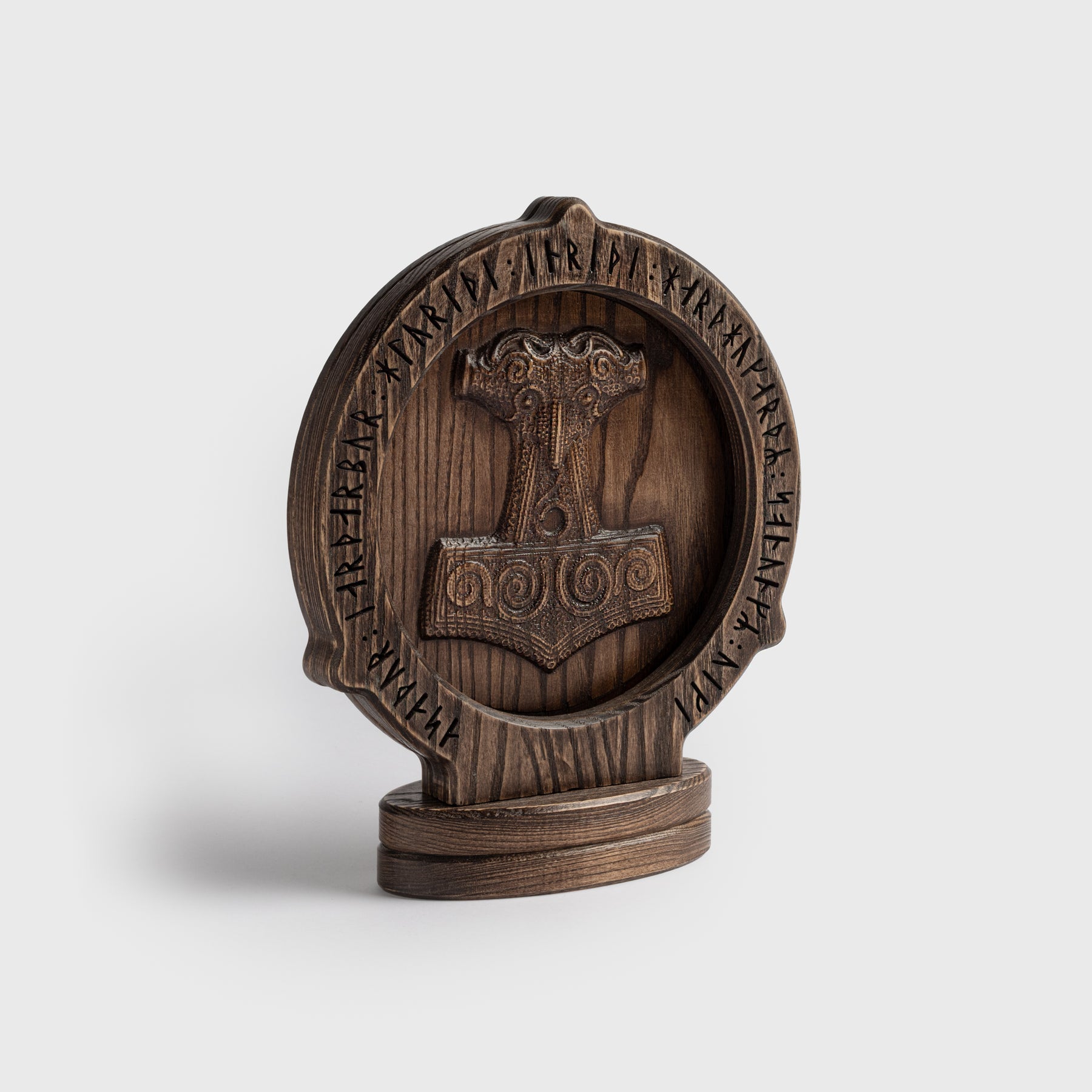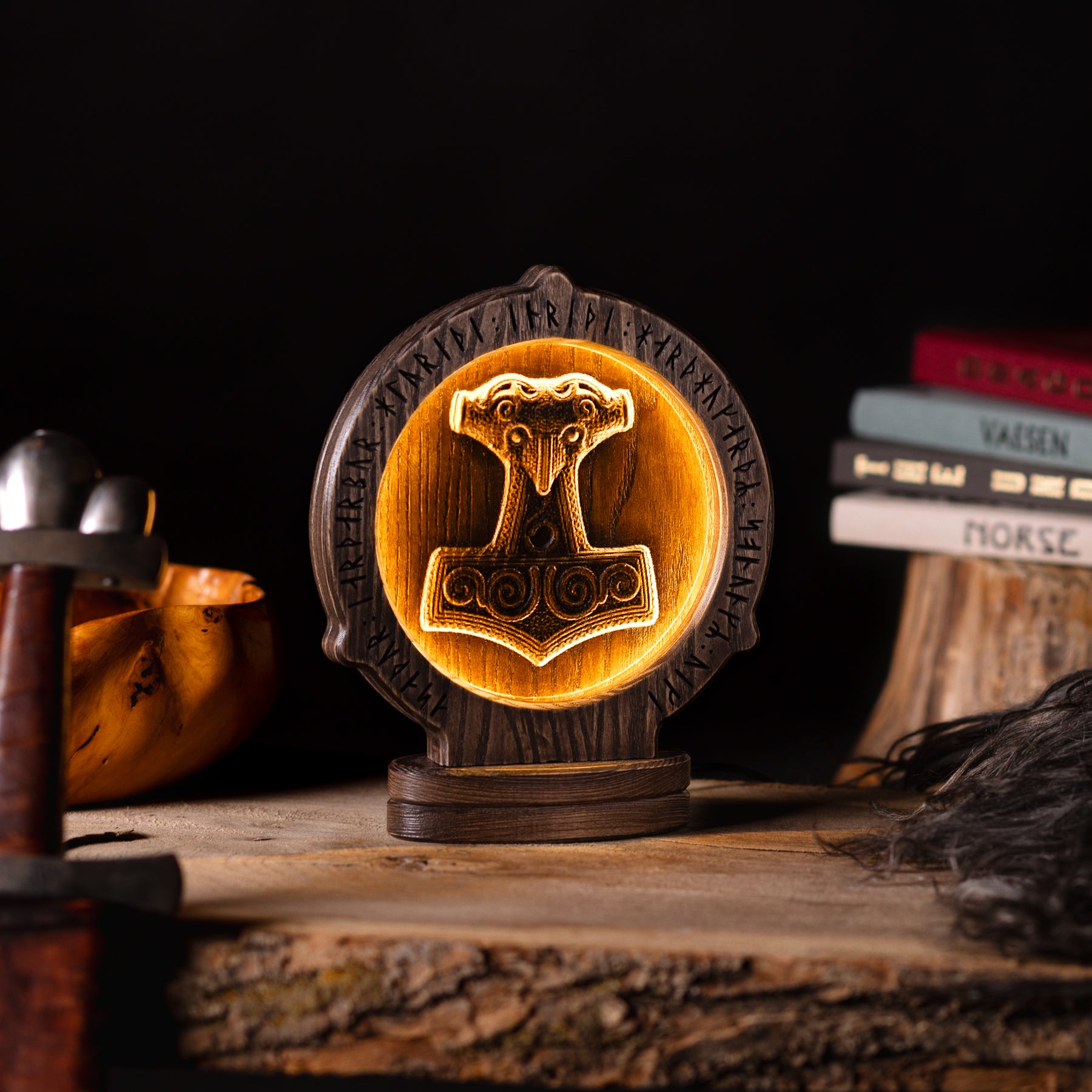 A masterfully crafted oak lamp featuring a beautifully illuminated Thor’s Hammer, inspired by a Viking Age find from Skåne, Sweden. The surrounding frame is carved with runes bearing various names of Thor, along with an ancient protective formula in Old Norse that translates to: