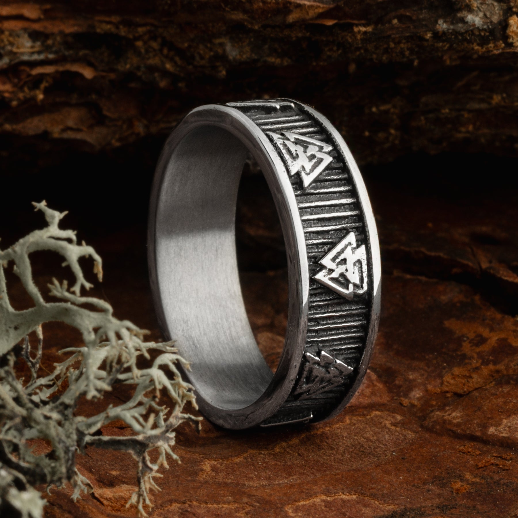 A contemporary design inspired by authentic Viking artifacts. Made out of Stainless Steel, it depicts Valknut symbols and comes in sizes #8 to #15.