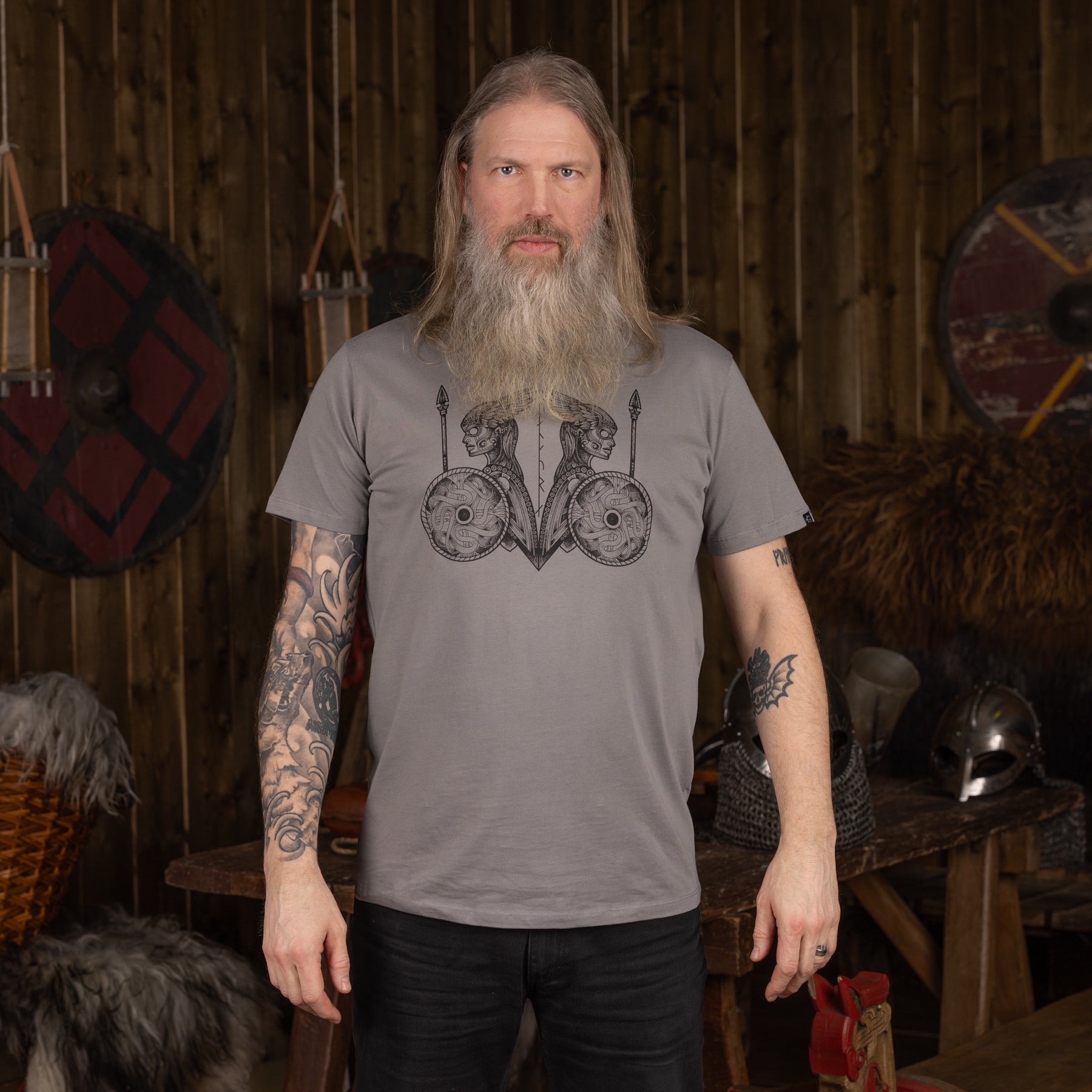 The shirt printed with two guarding Valkyries. A stave rune with "Valkyria" is positioned between them.