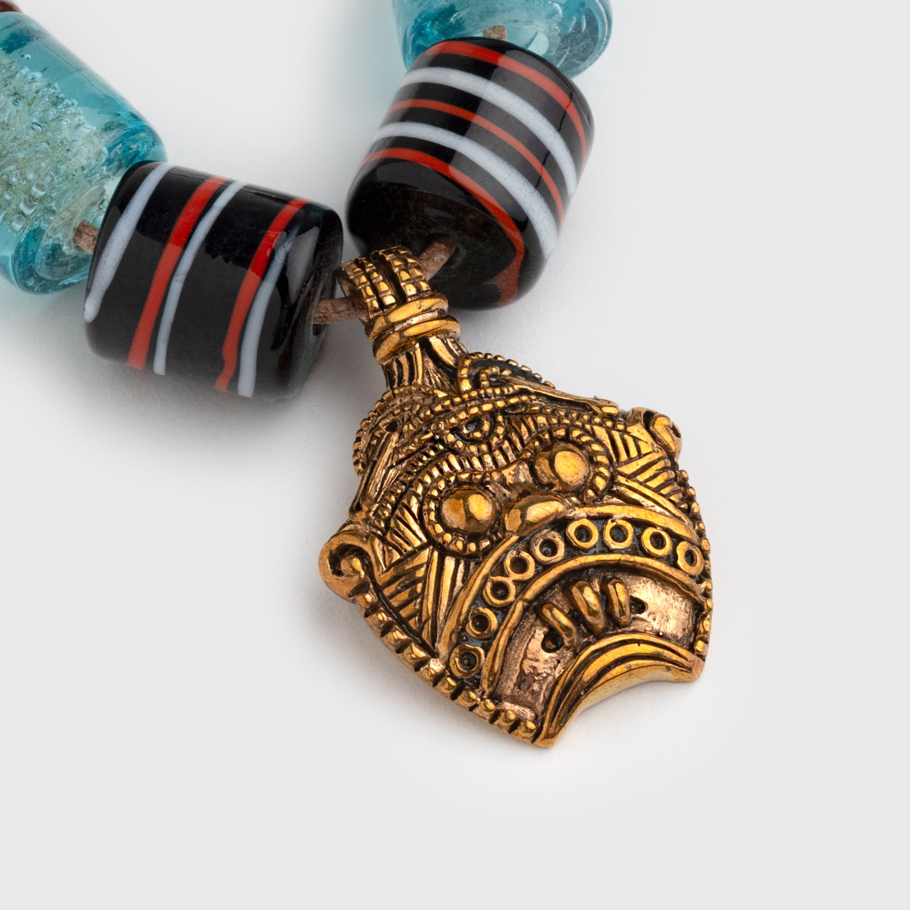 Reproduction of the extraordinary Loki amulet find made in 2015 in Vejen, Denmark as a ready to wear necklace with Viking glass beads. It is believed to depict Loki with his mouth sewn shut as in described in Norse mythology. The original find is today located at the Danish National Museum. The amulet is handmade in solid bronze.