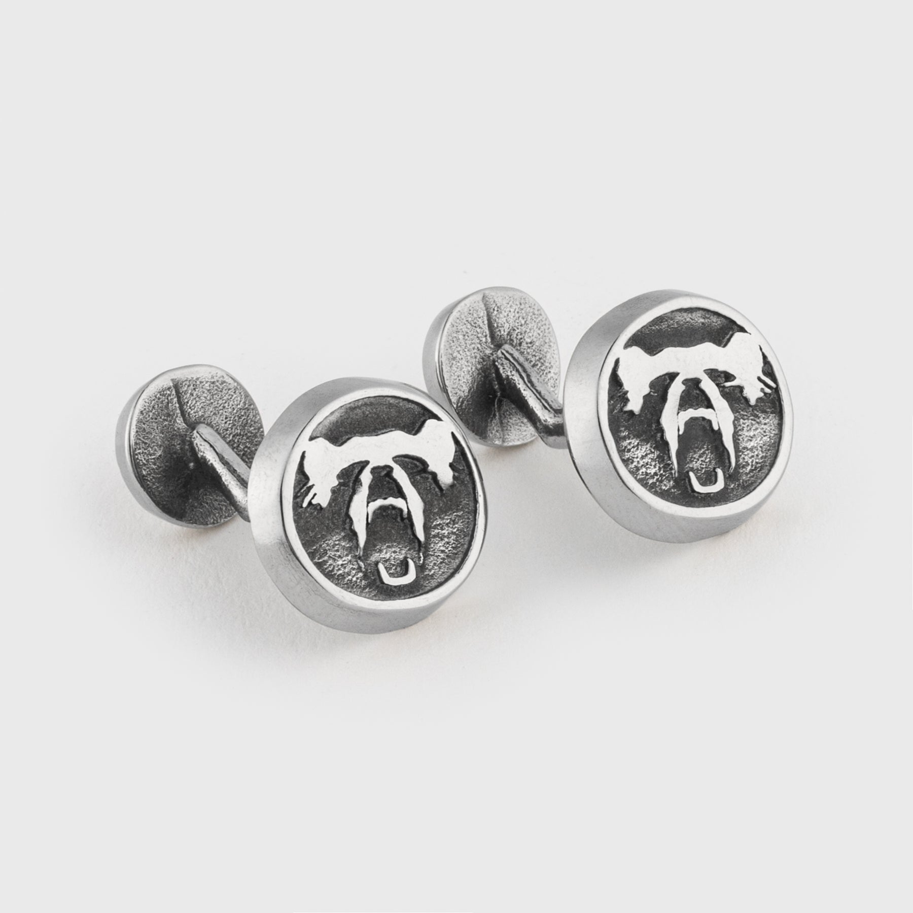 Ett par manschettknappar med Grimfrosts Berserker-design med en rytande björn. Björnen representerar sinnesstämningen hos en rasande bärsärker. Kombinera dem med en Berserker slipsnål.