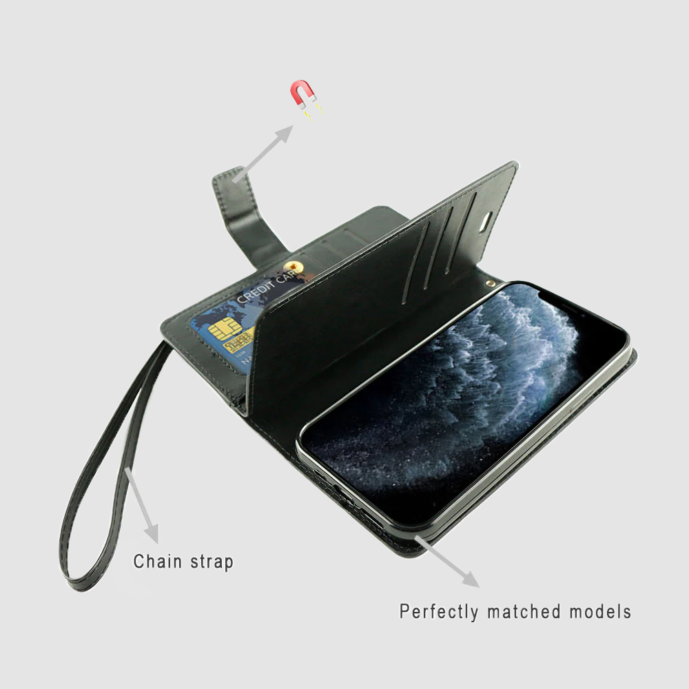 Mobiltelefonfodral med 9 kreditkortsfack, en fotoram, 3 kontantfack och en plånbok med dragkedja. Fodralet har en kedjerem och en ingraverad runlogotyp med texten "Thor Einridi Viki". Det är en skyddsformel från vikingatiden som översätts från fornnordiska till "Thor, He Who Rides Alone, Bless" eller "Thor ,He Who Rides Alone, Protect".