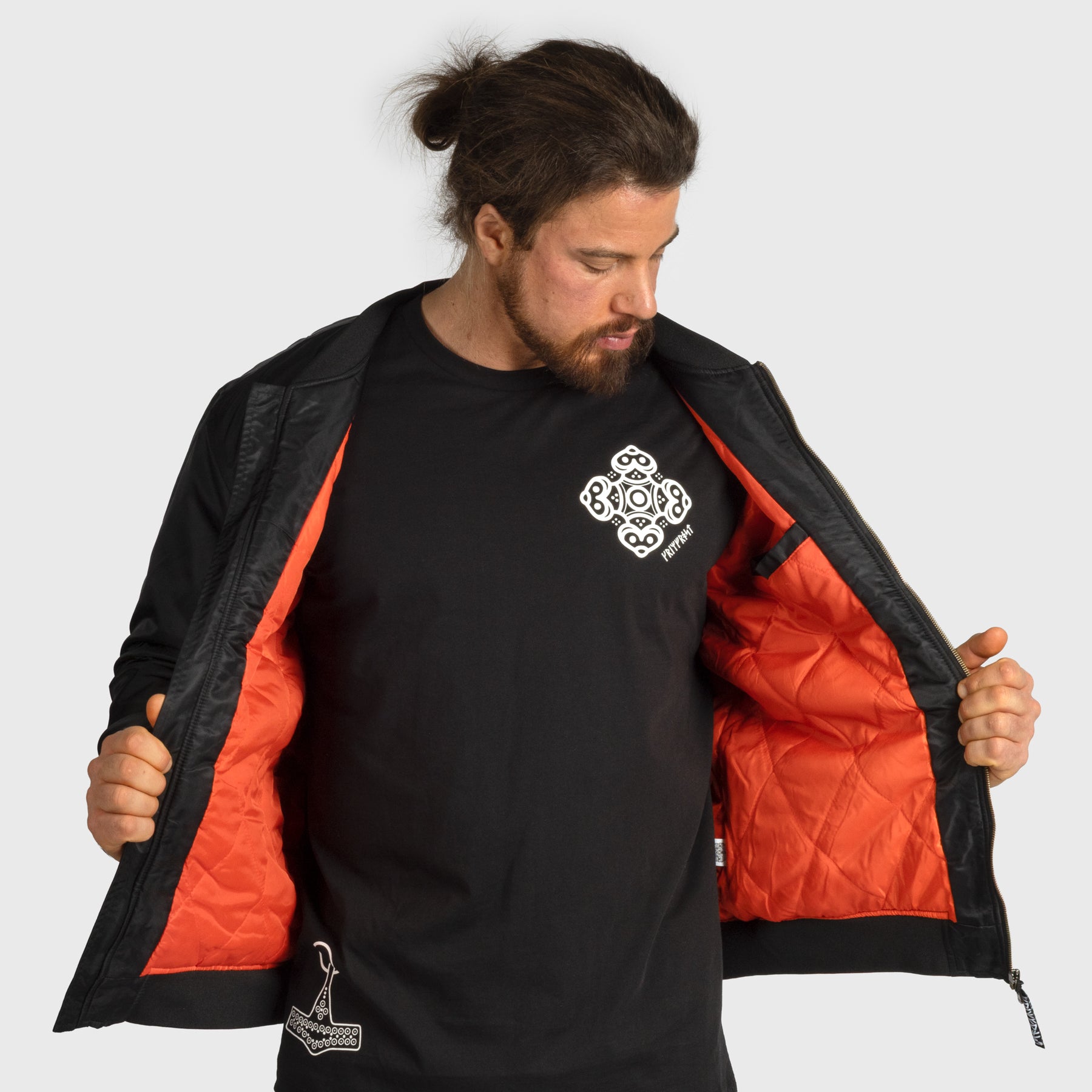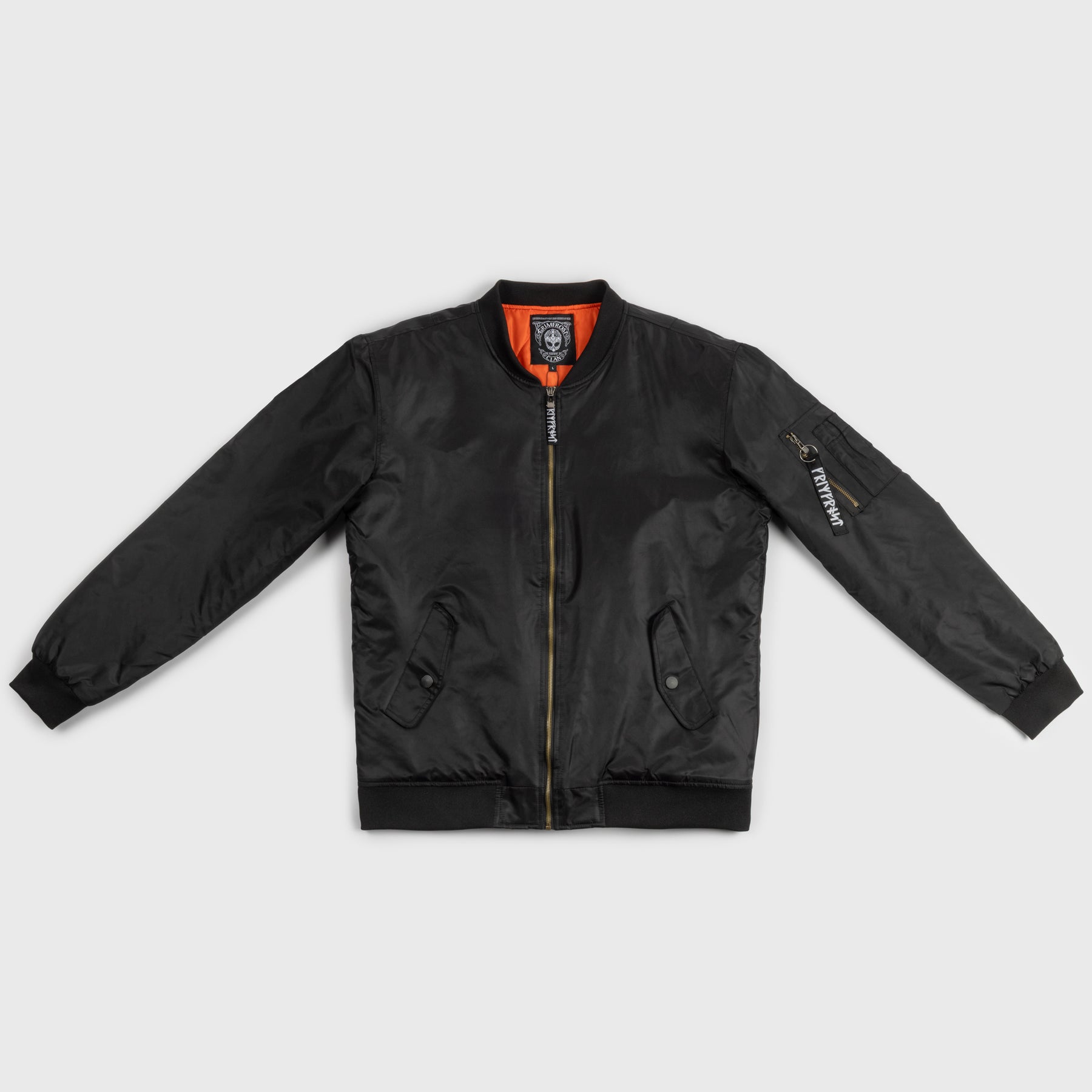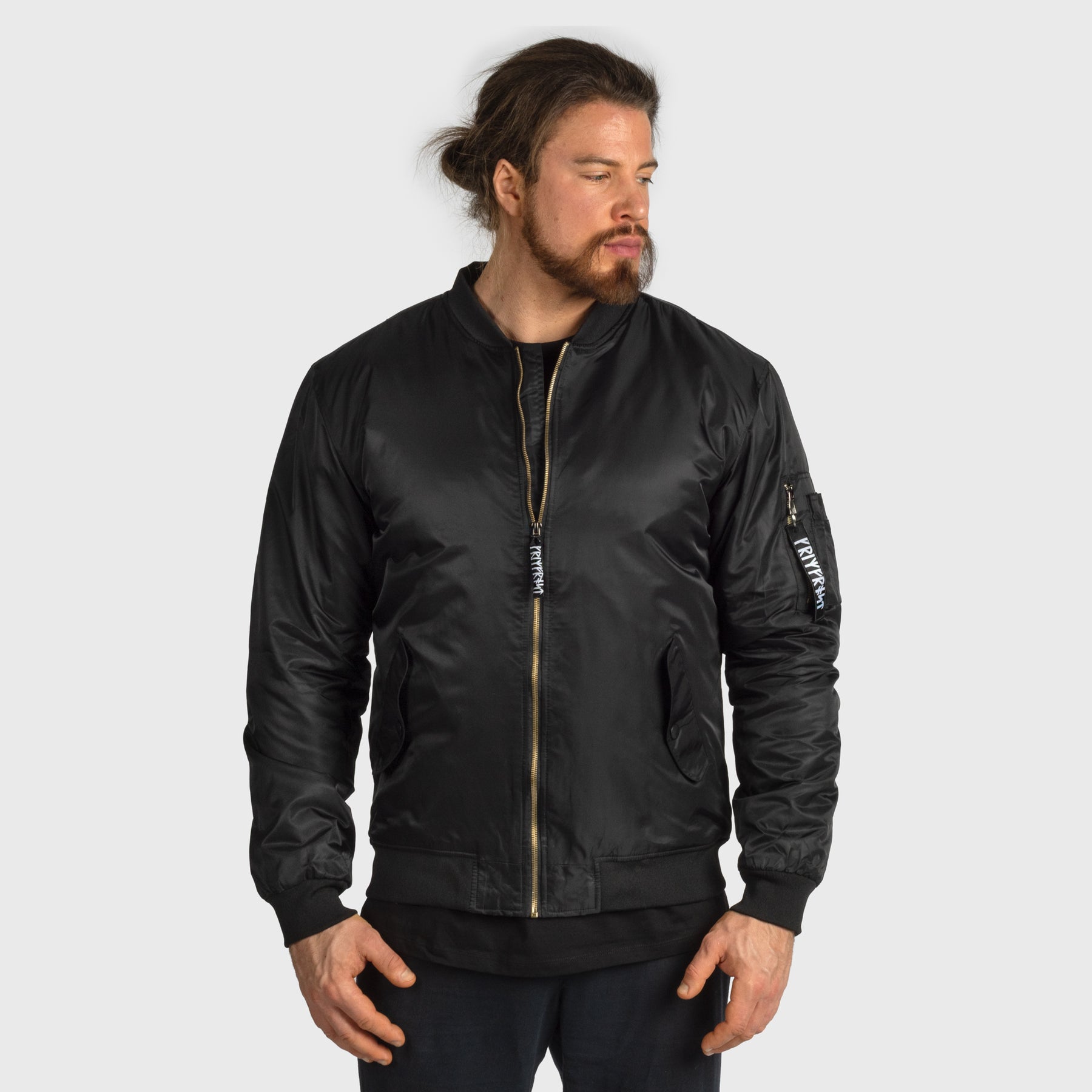 Klassisk bomberjacka tillverkad av 100% polyester för hållbar prestanda i alla väder. Den tidlösa silhuetten kombinerar urban stil med praktisk funktionalitet, perfekt för vardagsbruk eller som ett extra lager när det är kallt ute. Speciellt tillverkad för Grimfrost med runtaggar och märken.