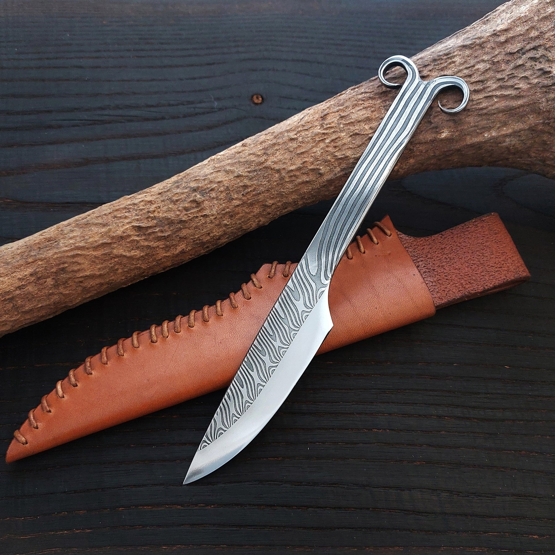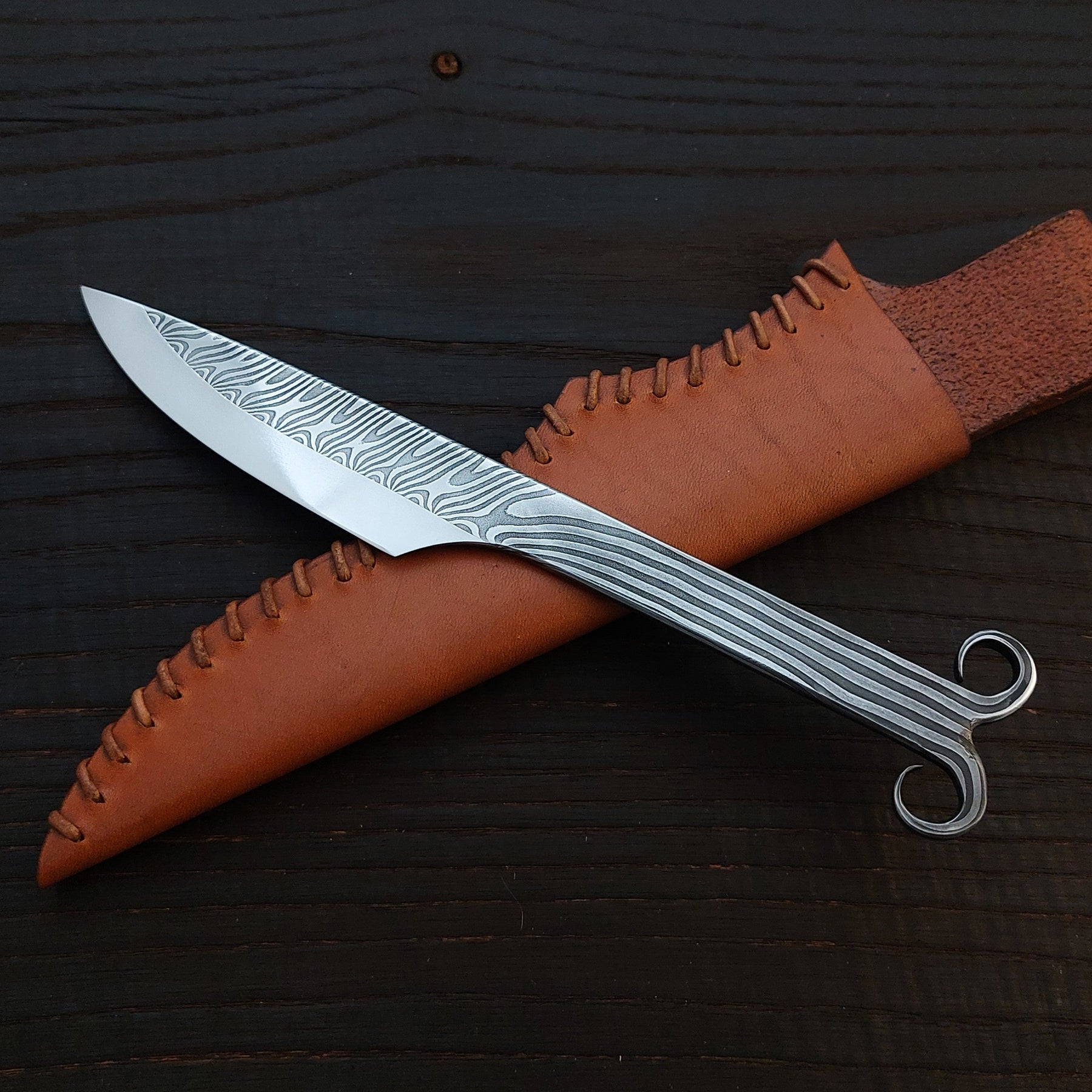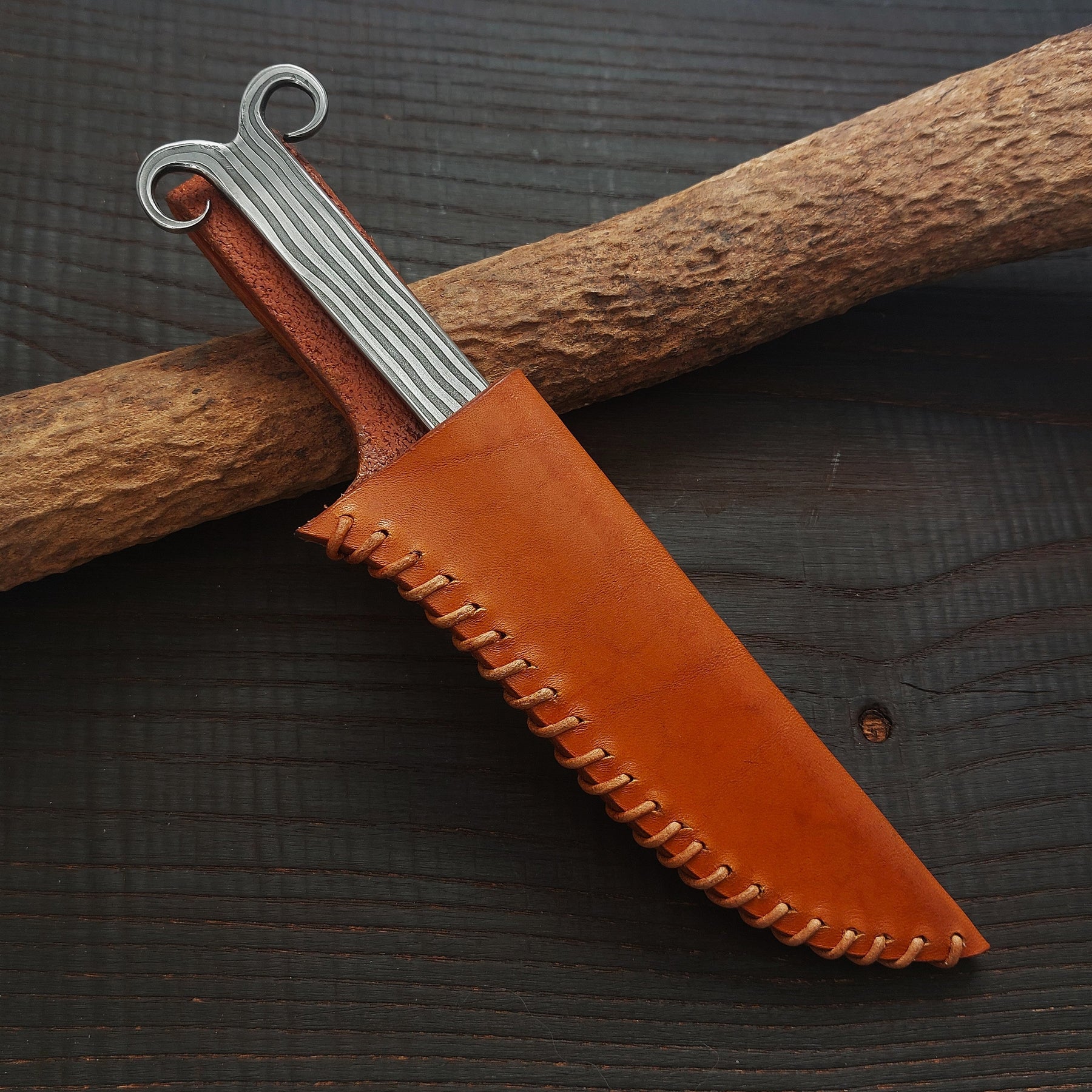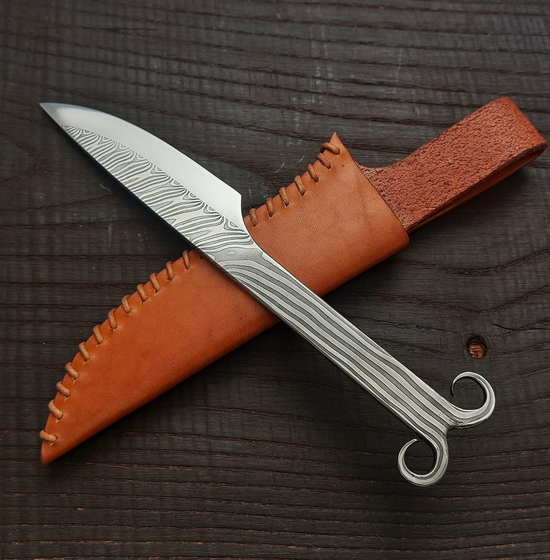 Högkvalitativ kniv mönstersvetsat blad. Handgjort kastanjebrunt läderfodral. Detta exemplar är individuellt handgjort med noggrann uppmärksamhet på historiska detaljer och traditionella smidestekniker, vilket ger den en karaktär som känns verkligt levande.
