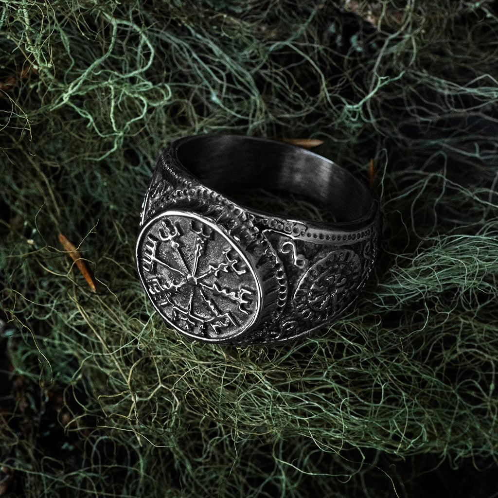 En modern design inspirerad av autentiska vikingatida fynd. Ringen är tillverkad i rostfritt stål och föreställer Vegvisir-symbolen och finns i storlekarna #8 till #15.