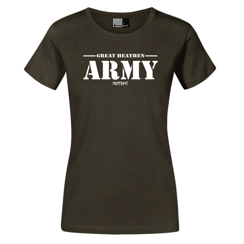 Premium soft-fitted women's t-shirt. It is handprinted in Sweden with: "Great Heathen Army" and Grimfrost's runic logo.